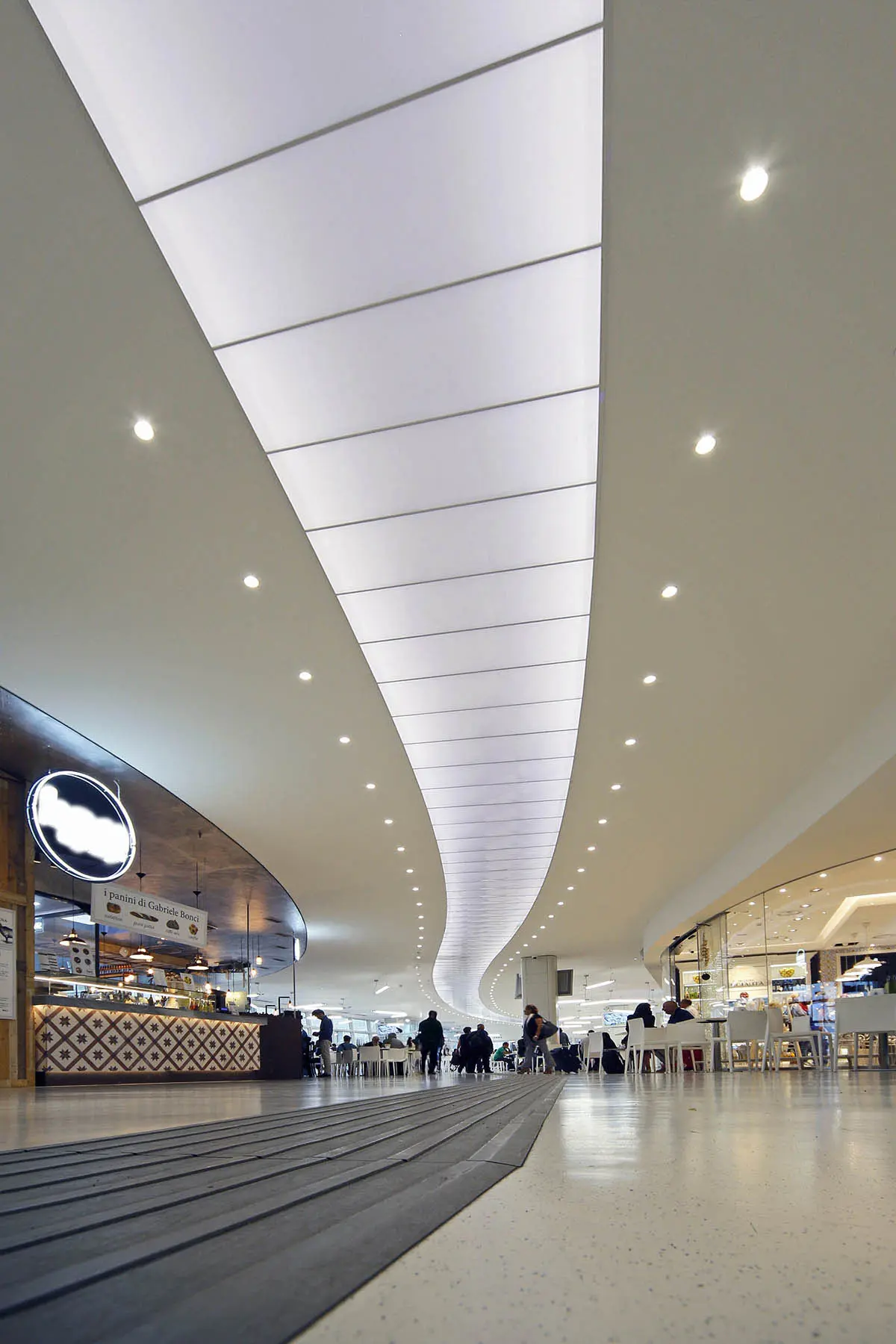 Nell’area McDonald’s di Roma Termini, il controsoffitto si trasforma in un elemento funzionale e architettonico, capace di integrare impianti e illuminazione con eleganza. Realizzato con pannelli modulari in lana di roccia su struttura a T a vista, il sistema è completato da una struttura su misura a sezione omega, progettata per accogliere LED e garantire ordine visivo. In equilibrio con il contesto archeologico delle Terme di Diocleziano, l’intervento adotta materiali neutri e soluzioni leggere, coniugando innovazione tecnica e rispetto del patrimonio.