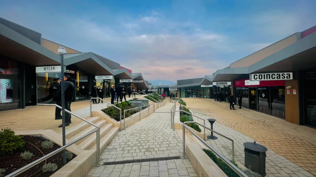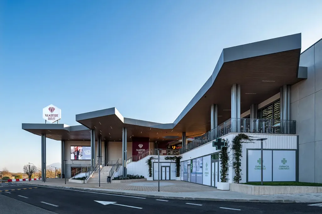 Nel progetto di ampliamento del Valmontone Outlet, la nuova copertura con rivestimento in alluminio tipo Prefa unisce protezione, efficienza energetica ed eleganza architettonica. Le pensiline con doghe W35 in finitura rovere chiaro arricchiscono l’ingresso con giochi di luce e ombra. Coronamenti su misura completano l’intervento, definendo un’immagine contemporanea e curata nei minimi dettagli.