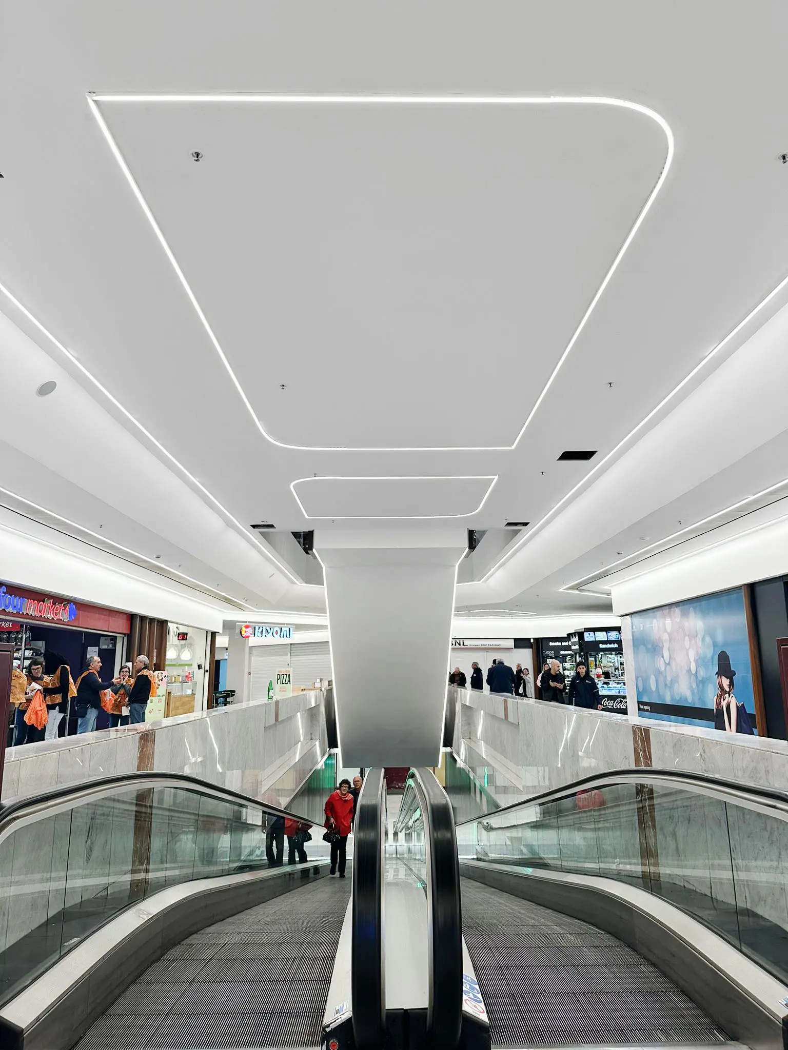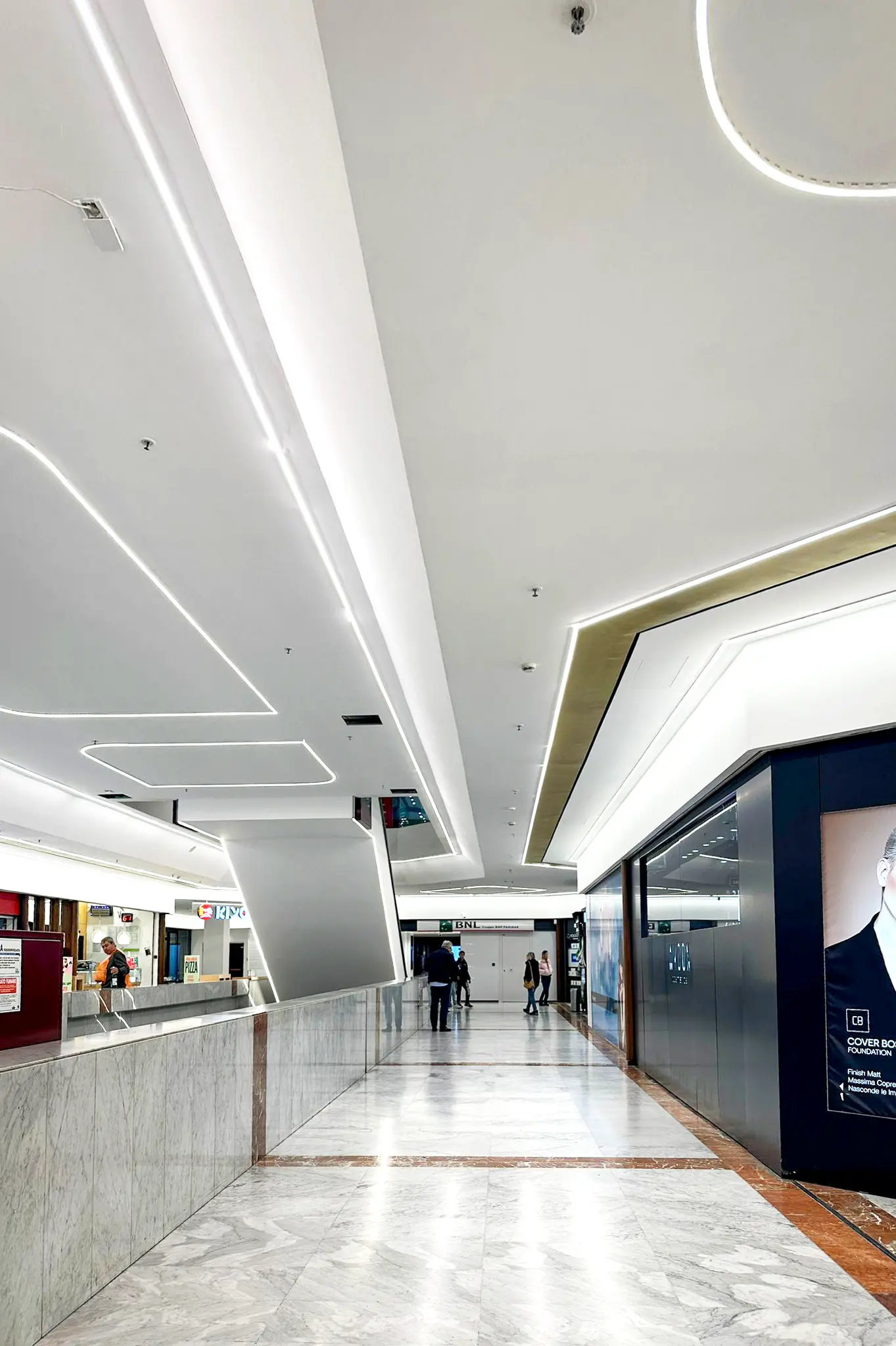 Il progetto di riqualificazione degli spazi interni del Centro Commerciale di Empoli ha previsto una controsoffittatura elegante in rete stirata, che conferisce leggerezza visiva e continuità agli spazi. Il materiale scelto è resistente e permette alla luce di permeare l’ambiente, creando un’atmosfera moderna e ariosa. Le aree di percorrenza sono state arricchite da cannon lumière in cartongesso bianco, progettati per accogliere la luce naturale e rendere l’ambiente luminoso e accogliente. Questa scelta progettuale non solo migliora l’esperienza visiva, ma contribuisce anche a ridurre il consumo di energia, ottenendo un perfetto equilibrio tra design contemporaneo e sostenibilità.