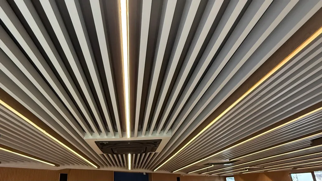 Il nuovo controsoffitto in doghe metalliche a passo e altezza variabile valorizza la sala conferenze con un design tecnico e architettonico raffinato. Il sistema, composto da doghe LED130 e W35 con accessori integrati, accoglie impianti e illuminazione in modo ordinato e ispezionabile. Le variazioni di altezza evocano le volte classiche in chiave contemporanea, offrendo profondità, comfort e qualità percettiva all’ambiente.